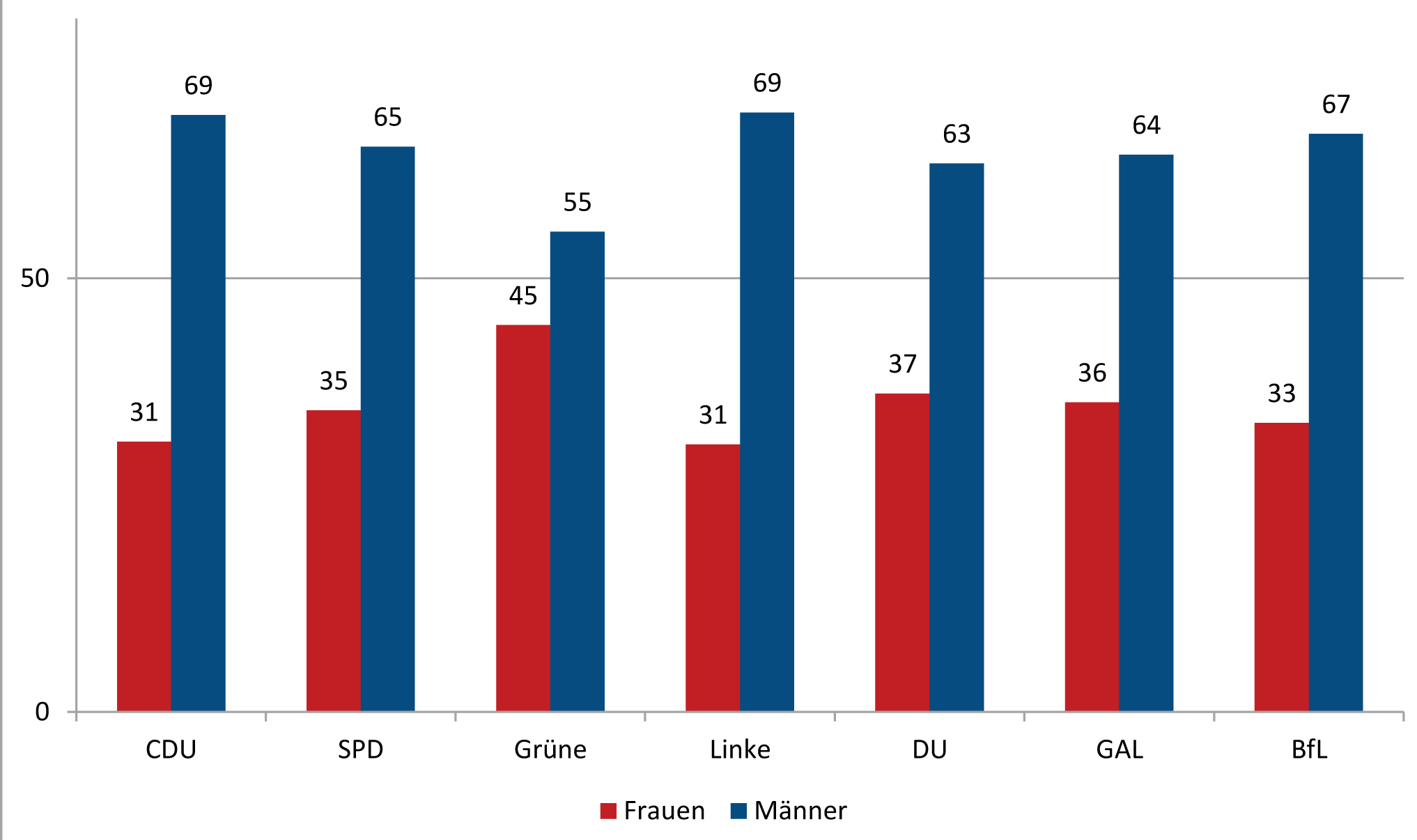 Den höchsten Anteil von Frauen unter den Partei-Mitgliedern hatten 2017 Bündnis90/Die Grünen mit 45%, gefolgt von den „Unabhängigen“ (DU) mit 37%, „grün+alternativ+links“ (GAL) mit 36% und der SPD mit 35%.