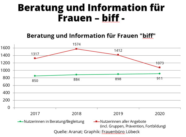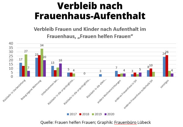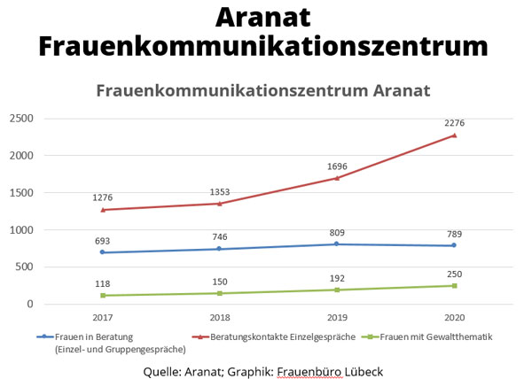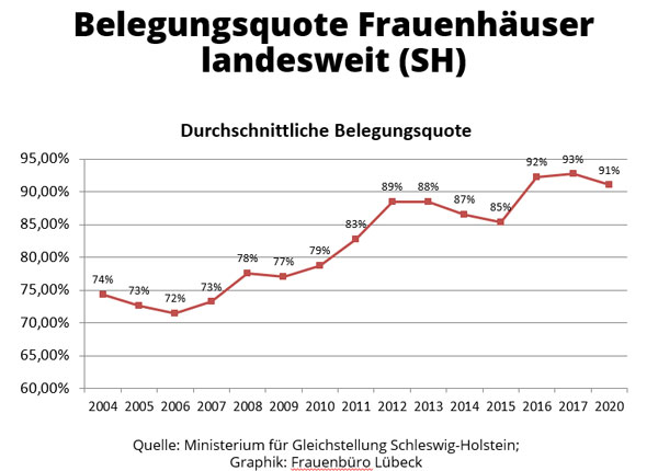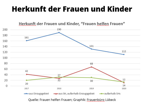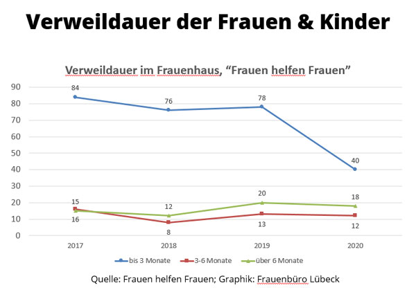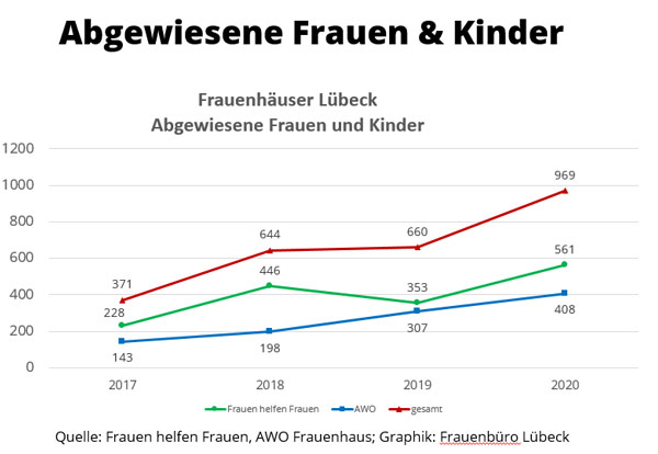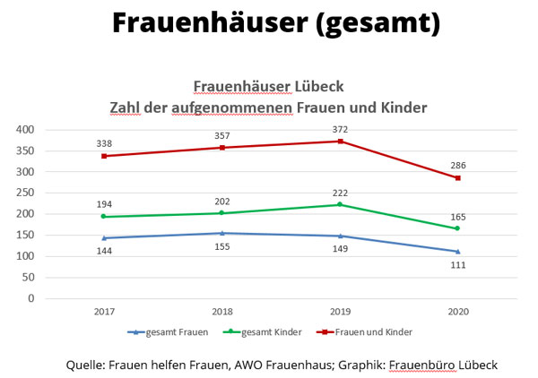 Im Bereich der „Häuslichen Gewalt“ registrierte die Polizei in den vergangenen Jahren mehr Einsätze (2017: 629 Einsätze), jedoch v.a. aufgrund einer Umstellung der Zählweise/Statistik. Die Staatsanwaltschaft registrierte gleichbleibend hohe Verfahrenszahlen (2017: 1819) und die Frauenhäuser in Lübeck konnten zwischen 2014 und 2017 jährlich zwischen 338 und 400 Frauen und Kinder aufnehmen. Allerdings mussten 2016 aufgrund nicht ausreichender Frauenhaus-Plätze auch über 770 Frauen und Kinder abgewiesen werden. Auch bei den Frauenprojekten (Aranat, biff, Frauennotruf) sind die Nutzungszahlen weiterhin hoch.