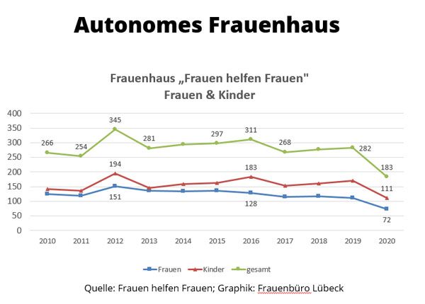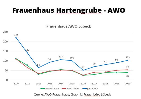 In den Jahren 2014-17 fanden pro Jahr zwischen 400 und 338 Frauen und Kinder Schutz vor Gewalt in einem der beiden Lübecker Frauenhäuser. 2010 konnten in beiden Häusern – aufgrund der damals höheren Platzzahl - noch 487 Frauen und Kinder Zuflucht finden. Bis Ende 2011 verfügte Lübeck über 82 Frauenhaus-Plätze (AWO: 42, Verein „Frauen helfen Frauen e.V.“ 40 Plätze). Dann wurden die Plätze des AWO-Frauenhauses von der damaligen Landesregierung abgebaut. 2013 wurde es mit nur 15 (statt 36) vom Land finanzierten Plätzen wiedereröffnet. Auch die Stadt sparte daraufhin 6 städtische finanzierte Plätze ein. Aufgrund der dauerhaften Überbelegung beider Frauenhäuser und der hohen Zahl der Frauen und Kinder, die abgewiesen werden mussten (siehe unten), beschloss die Bürgerschaft im November 2017, rund 250.000 Euro für 14 zusätzliche Frauenhausplätze zur Verfügung zu stellen. Das Ministerium für Justiz, Europa, Verbraucherschutz und Gleichstellung legte 2019 ein befristetes Landesprogramm für 30 weitere Plätze auf, von denen 5 Plätze auf Lübeck entfallen.