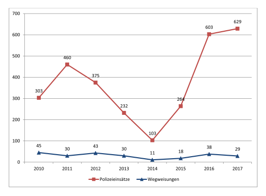 Bei akuter Gefahr kann die Polizei in Schleswig-Holstein eine sogenannte „Wegweisung“ aussprechen, d.h. sie kann die gewalttätige Person für mehrere Tage der Wohnung verweisen. In Lübeck sprach die Polizei in den Jahren 2014-2017 pro Jahr zwischen 11 (2014) und 38 (2017) Wegweisungen aus. Landesweit gab es in Schleswig-Holstein laut Justizministerium 2015 382 Wegweisungen, 2016 550 und 2017 540 nach §201a LVwG.