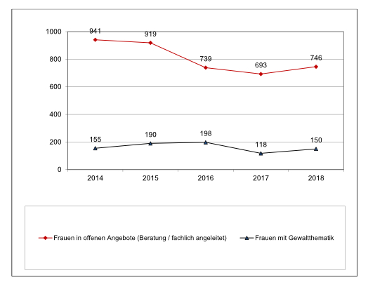 2017 nahmen 621 Personen (von Gewalt betroffene Frauen und Mädchen oder unterstützende Personen) Beratung in Anspruch, dabei ging es bei 315 Personen um häusliche Gewalt, bei 402 um sexualisierte Gewalt und bei 35 um Stalking. Die Zahl der beratenen Personen schwankte zwischen 683 im Jahr 2015 und 621 im Jahr 2017.