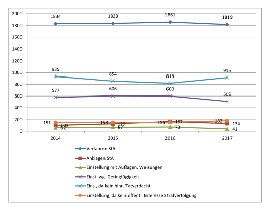 Allerdings wurden auch viele Verfahren von der Staatsanwaltschaft eingestellt. Grund für die Einstellung von Verfahren war vor allem, dass die Staatsanwaltschaft keinen hinreichenden Tatverdacht begründen konnte. Im Jahr 2017 wurde ca. die Hälfte der Verfahren (915 von 1819) aus diesem Grund eingestellt. Taten können von der Staatsanwaltschaft auch als "geringfügig" eingeschätzt und deshalb eingestellt werden. Dies war 2017 in 509 Verfahren der Fall. 2017 kam es zu 134 Anklagen, 2016 sogar zu 167.