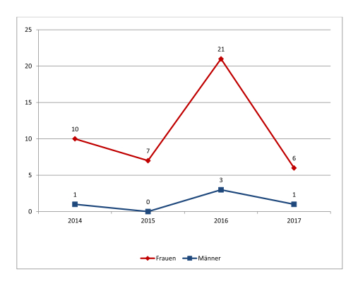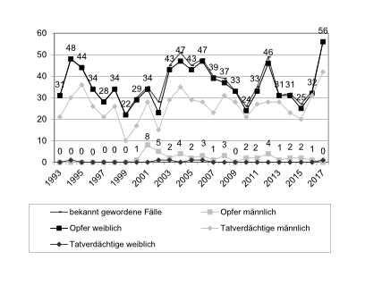 Die Zahl der weiblichen Opfer sexuellen Missbrauchs stieg zwischen 2014 und 2017 von 30 auf 59. Bei den Jungen schwankten die Zahlen zwischen 4 (Jahr 2016) und 11 Opfern (Jahr 2015). Von sexuellem Missbrauch an Kindern sind Mädchen (78%) stärker als Jungen betroffen. Trotzdem ist hier der Anteil männlicher Opfer (22%) höher als bei anderen Sexualdelikten.