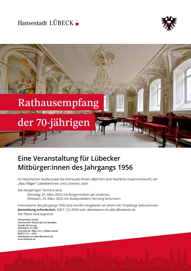 Die Organisation liegt beim Bereich Soziale Sicherung, der den Mitbürger: innen des Jahrgangs 1956 anbietet, sich ab 09. Februar 2026 telefonisch unter 122-4454 oder per Email: aktivitaeten-im-alter@luebeck.de für einen der Empfänge anzumelden. Bitte beachten Sie, dass die Anzahl der Plätze begrenzt ist. Der Vollständigkeit halber, teilen Sie uns bitte Ihre Telefonnummer und das Geburtsdatum mit.