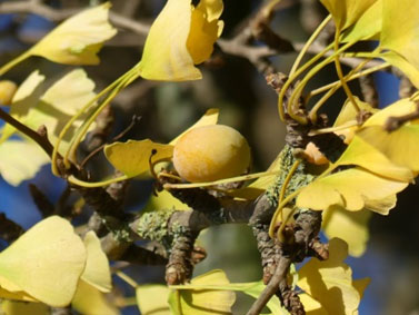 Seine Samen sind außen von einer gelb-fleischigen Samenschale umhüllt und ähneln einer Mirabelle. Der im Sonnenlicht silbrig glänzende Samenmantel gibt dem Ginkgo auch seinen Namen: Dieser leitet sich von Gin-Kyo ab, was in westliche Schrift übertragen 'Silberaprikose' bedeutet. Bei Neupflanzungen werden männliche Exemplare bevorzugt, weil die reifen Samenmäntel der weiblichen Bäume unangenehm riechen können.