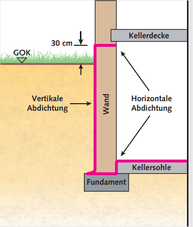 Die vertikale Abdichtung verhindert, dass Feuchtigkeit seitlich in das Bauwerk eindringt, die horizontale macht ein Eindringen von unten unmöglich. Beide Abdichtungen eignen sich nicht nur für Neubauten, sondern auch im Bestand. Hier sind die Maßnahmen jedoch mit einem erheblichen finanziellen und technischen Aufwand verbunden und sollten nur von Fachfirmen geplant und hergestellt werden. So muss für eine nachträgliche vertikale Außenabdichtung das Bauwerk außenseitig freigelegt und die beschädigte Mauer vorbehandelt werden. Als Abdichtungsstoffe kommen zum Beispiel Bitumenbeschichtungen und wasserdichte Kunststoffbahnen zum Einsatz. Eine spätere Horizontalabdichtung erfolgt unter anderem durch Injektionsverfahren. Bei diesen werden Abdichtungsstoffe mit einer Pumpe oder über einen Trichter in die Wand eingetragen.