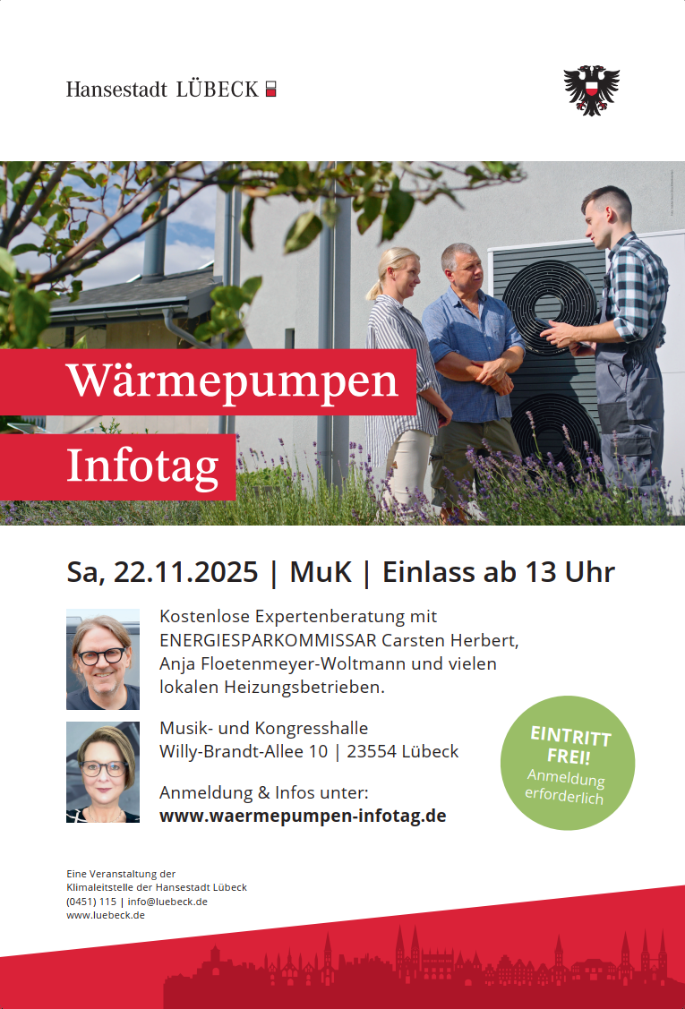 Großer Wärmepumpen-Infotag am 22. November 2025 in der Musik- und Kongresshalle Lübeck: Fachvorträge, Beratung und Ausstellung rund um die Heizung der Zukunft. Verständlich, praxisnah und herstellerunabhängig. Eintritt frei, Anmeldung erwünscht.