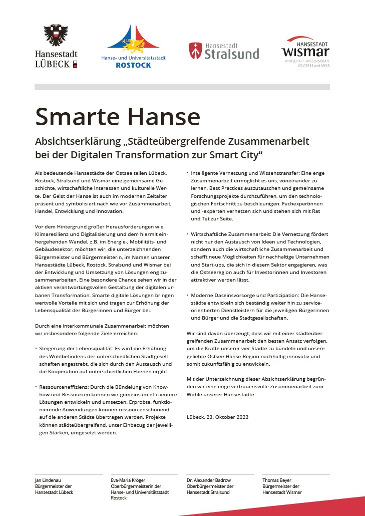 Die Bürgermeister:innen der vier Hanse- und Ostseestädte Lübeck, Rostock, Stralsund und Wismar haben heute die Absichtserklärung für eine städteübergreifende Zusammenarbeit bei der Digitalen Transformation zur Smart City unterzeichnet. Sie vereinbaren damit, zukünftig bei der Entwicklung und Umsetzung von digitalen Lösungen eng zusammenzuarbeiten. Dadurch sollen Kräfte gebündelt, Synergien geschaffen und die Lebensqualität der Bürger:innen in der Region erhöht werden. Weitere Ziele sind Ressourceneffizienz, intelligente Vernetzung und Wissenstransfer, wirtschaftliche Zusammenarbeit sowie moderne Daseinsvorsorge und Partizipation.