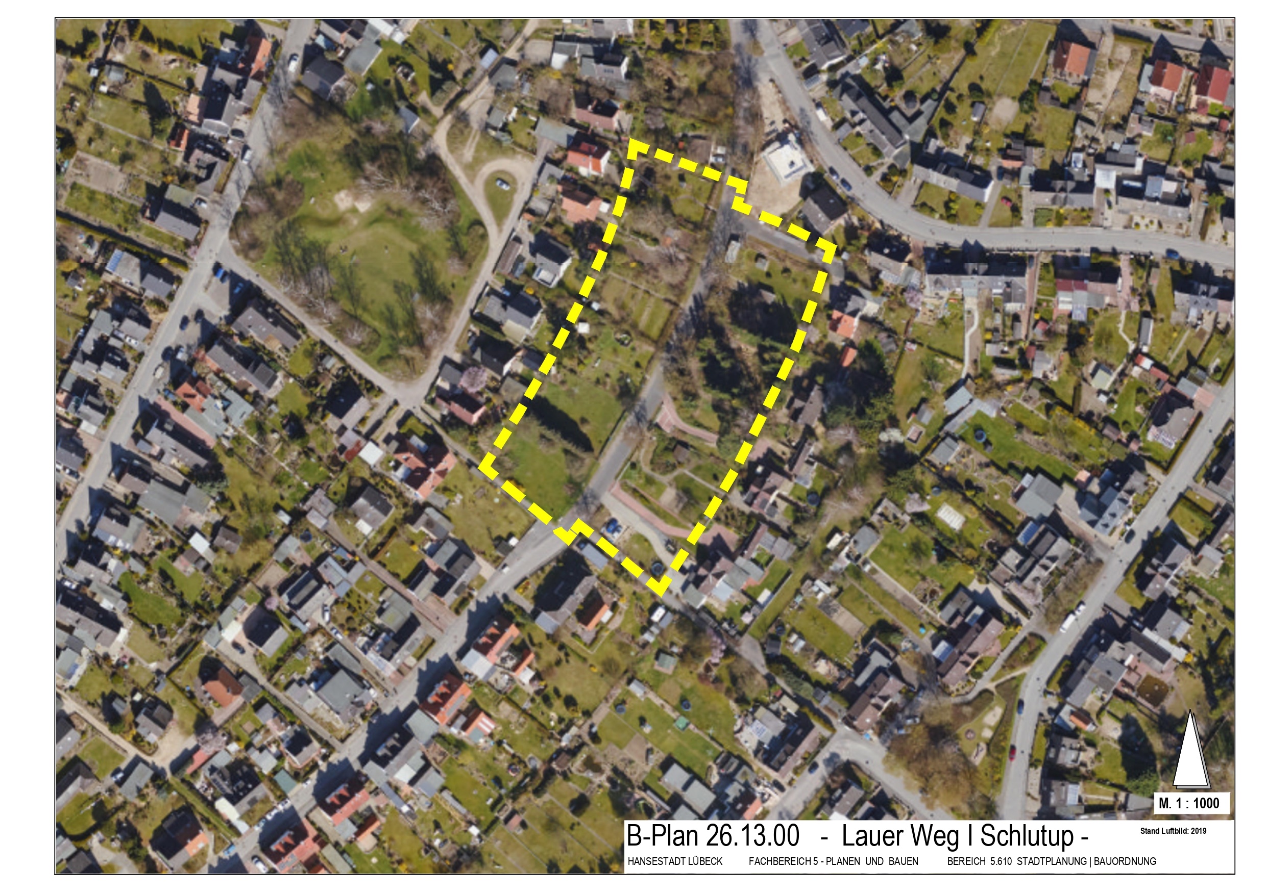 Der Geltungsbereich des Bebauungsplans 26.13.00 Schlutup / Lauer Weg liegt im Stadtteil Schlutup. Begrenzt wird das ca. 0,8 ha (8.270 m²) große Plangebiet:
