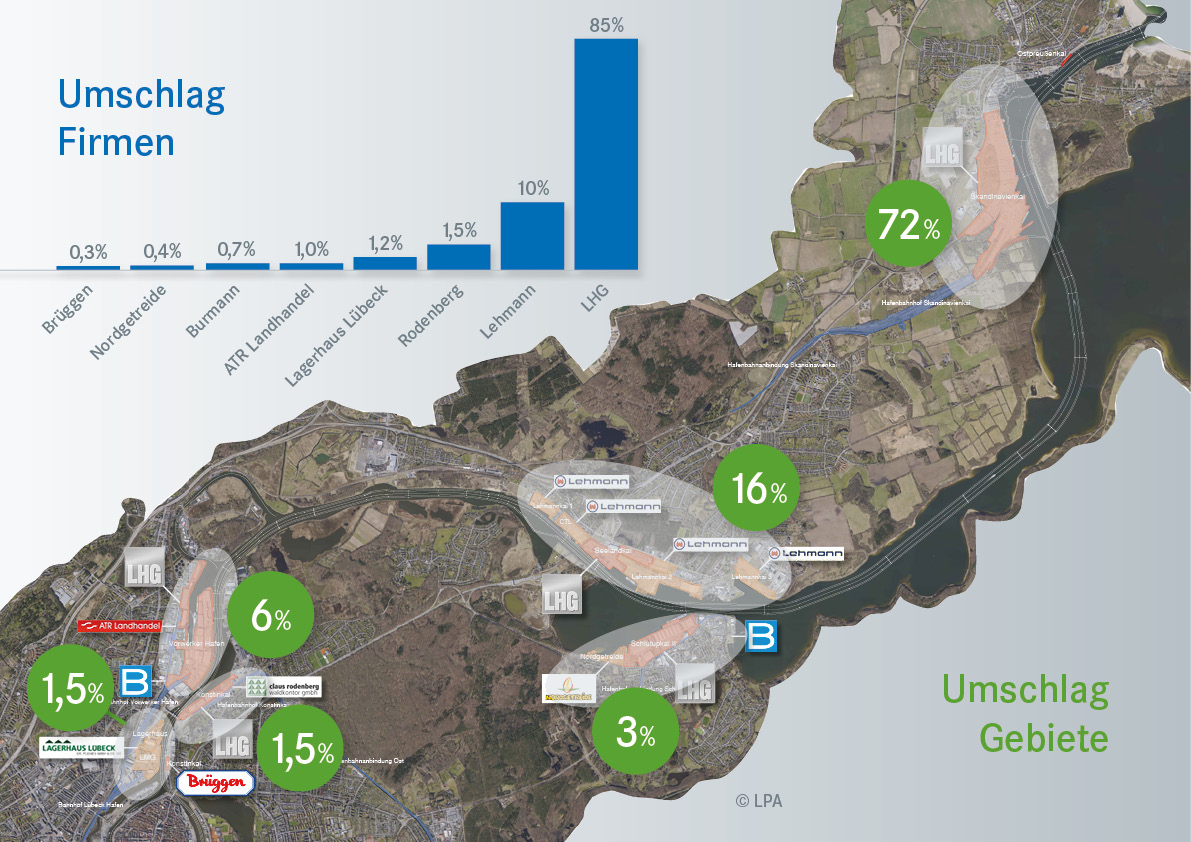 In 2018 wurden insgesamt 25,0 Millionen Tonnen Güter (brutto) umgeschlagen. Die Lübecker Hafen-Gesellschaft (LHG) hatte daran einen Anteil von rd. 85%. 10% entfallen auf Fa. Lehmann und 5% auf 8 kleinere Hafenumschlagsgesellschaften (Fa. Burmann Hafenlogistik, claus rodenberg waldkontor gmbh, ATR Landhandel, Lagerhaus Lübeck, Holztransporte Röhrs, Werkshäfen von Fa. Brüggen, Fa. Nordgetreide und Fa. LMG).