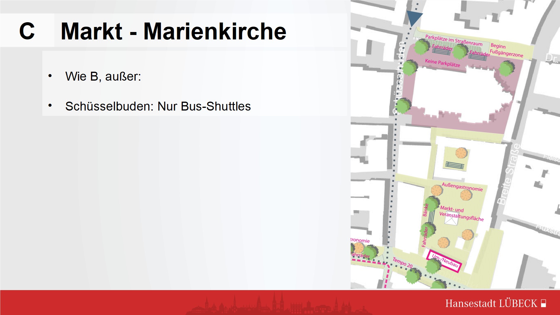 Variante B/C. Neubau nach Vorbild Torvehallerne finde ich gut, aber Marktseite sollte architektonisch zu den umliegenden Gebäuden passen. Aufwertung Marienkirche/Mengstraße ebenfalls sehr gut.