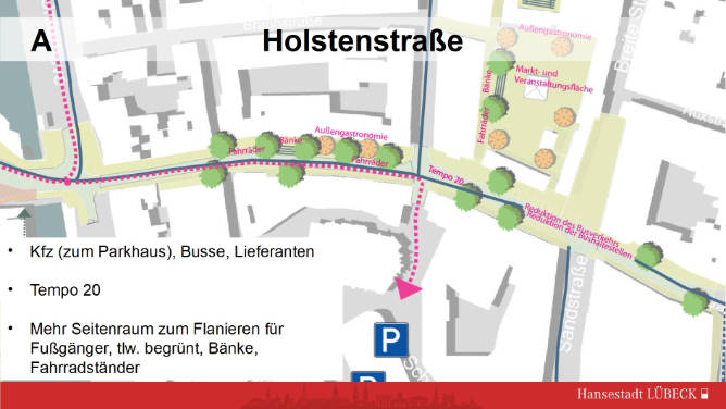 Die Holstenstraße ist komfortabel für alle Verkehrteilnehmer. Warum sollte man dies aufgeben? Mehr Bäume + Fahrradständer - ja! Autowarteschlangen a. d. Marienkirche geht gar nicht. ÖPNV muss bleiben.