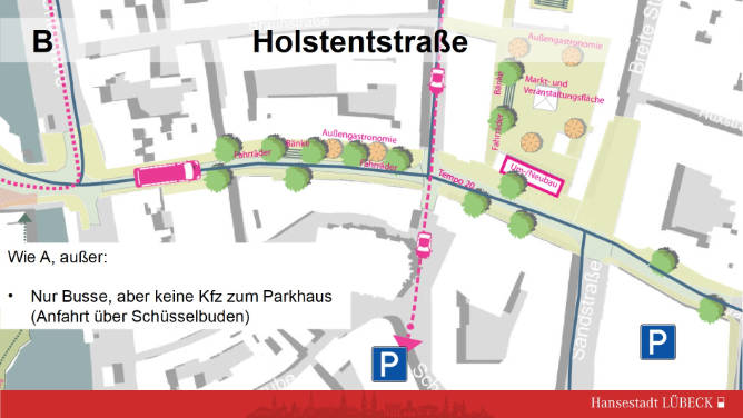 Das Parkhaus sollte zumindest so wie jetzt mit dem Auto über die Nordseite am Holstentor vorbei und dann über die Holstenstraße mit 20 km/h erreichbar sein.