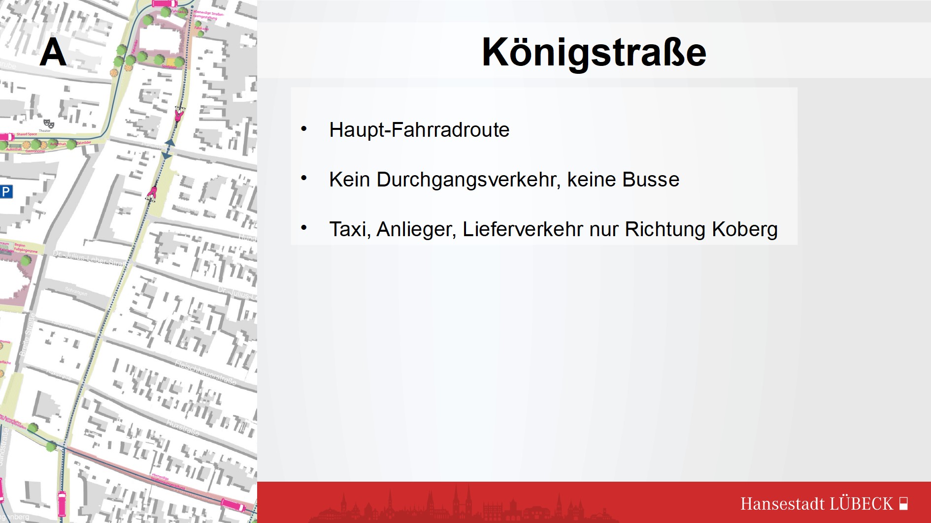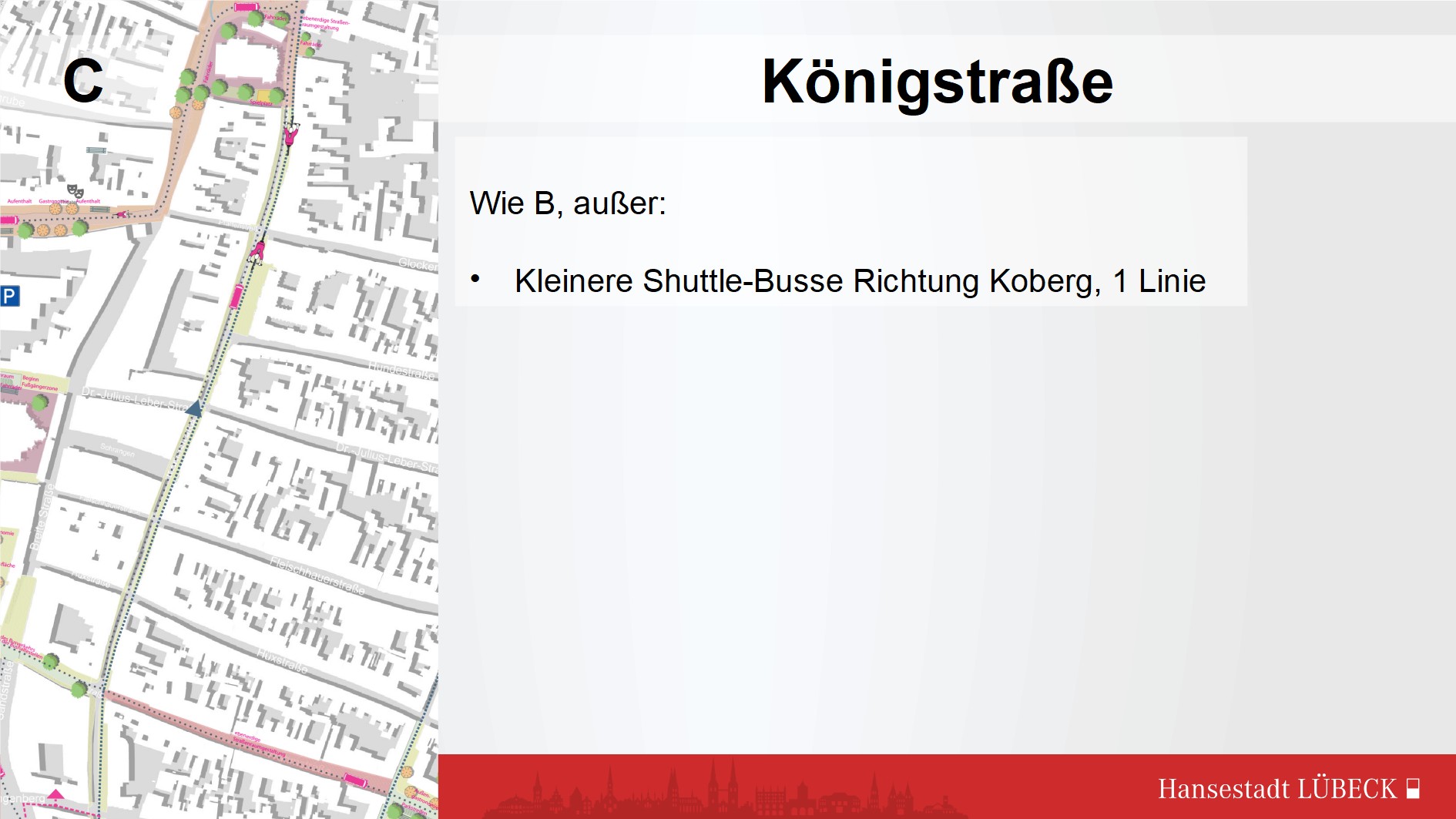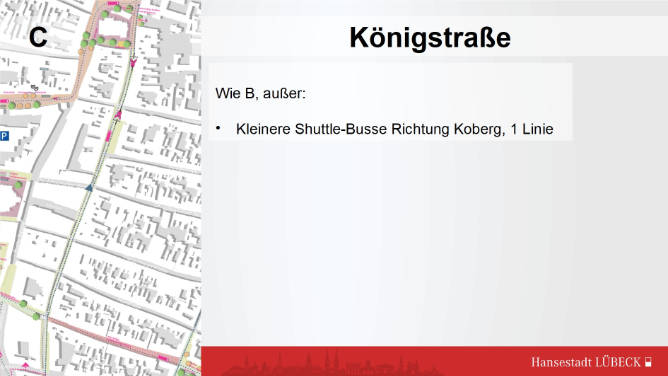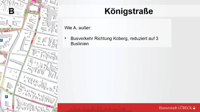 Variante A, Busse in beiden Richtungen über Fünfhausen. Die Fußgängerzone wird so vom ÖV an der Beckergrube direkt erreicht, von der Marienkirche nach 150 m, die Königstraße nach je 100 m mehr.