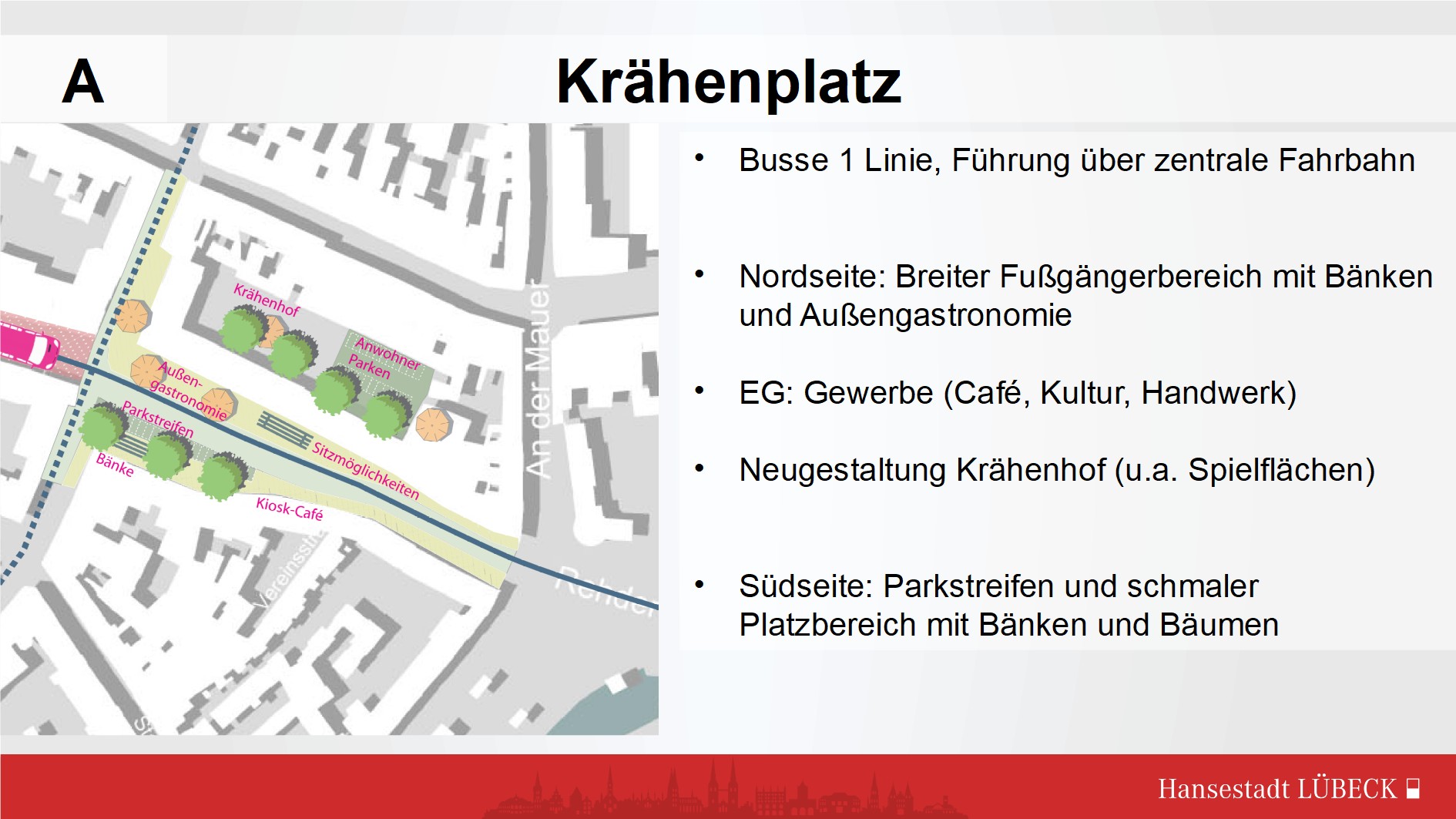 Diesen Platz endlich zum Leben zu erwecken - tolle Idee. Bussverkehr und Anwohnerparkplätze Balauerfohr sollten bleiben - somit max. Variante A. Mehr Grün und mehr Fahrradständer in die Innenstadt .