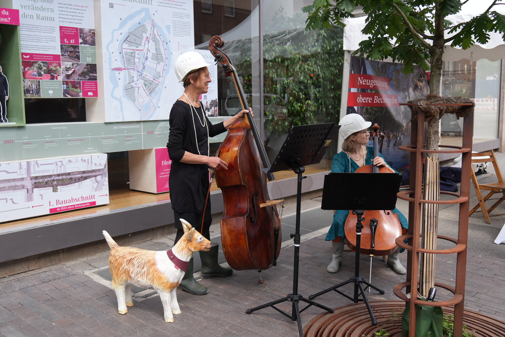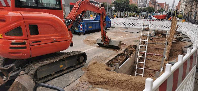 - Fußgänger:innen können die Baustelle und die Beckergrube nach wie vor passieren. Geschäfte, Gastronomie, medizinische Einrichtungen und das Theater bleiben fußläufig erreichbar.
