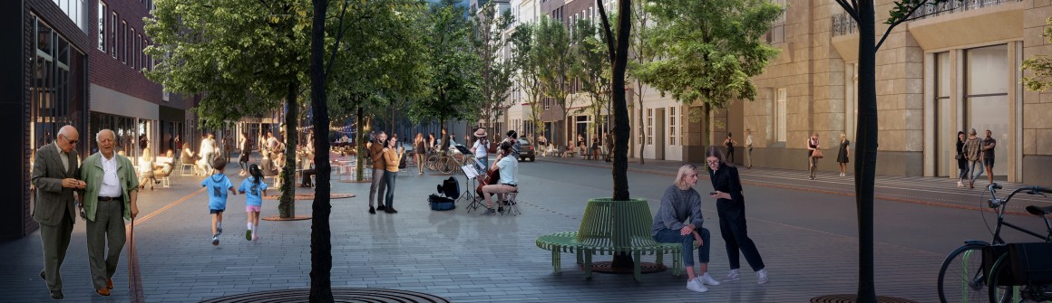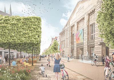 Der Beitrag von 1:1 Landskab verfolgt die Idee, die Beckergrube in ihrer Gesamtheit zu einem lang gestreckten grünen Platz zu formen und die komplexen technischen, funktionalen Anforderungen und Bedarfe in eine durch Baumpflanzungen geprägte Gestaltung zu übersetzen, die ein eindrucksvolles und für Lübeck überraschendes Bild zeichnet. Eine Vielzahl neu gepflanzter Bäume erwächst zu einem Schatten spendenden Blätterdach, das optimal auf die Anforderungen des Klimawandels reagiert und gleichzeitig eine Durchlässigkeit im Raum erzeugt. Das räumliche Konzept besticht durch seine konsequent umgesetzte Haltung, den Raum trotz der Straßenverkehrsfläche von Gebäudekante zu Gebäudekante zu denken. Es gelingt den Verfassern, eine hohe Durchlässigkeit im Raum zu erzeugen und der strengen Linearität der Straße etwas Prägendes entgegenzusetzen.