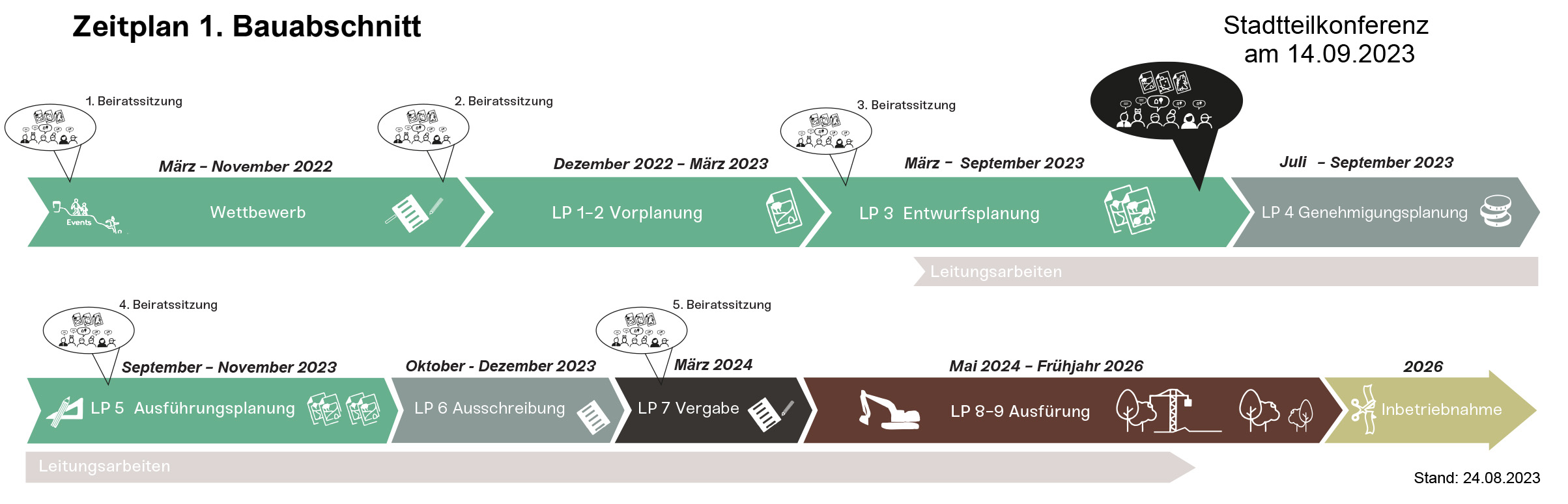 Im ersten Bauabschnitt sind in Multifunktionsstreifen Ladezonen für das Anliefern, Taxen- und Behindertenparkplätze sowie Fahrradabstellanlagen für rund 90 Fahrräder vorgesehen. Unter dem neuen Blätterdach sollen konsumfreie Sitzmöglichkeiten entstehen, sowie Flächen für Gastronomen und Einzelhändler ausgewiesen werden. Es wird eine kleine Freizeitfläche mit Tanzboden und Tribünenelement aus Holz errichtet, die für kleine Veranstaltungen genutzt werden kann. Die Wünsche der Bürger:innen, wie Tanzboden, Urban Gardening-Hochbeete und konsumfreie Sitzgelegenheiten sowie bestehende, bewährte Elemente (z.B. Food Sharing-Schrank) finden sich im Entwurf wieder...