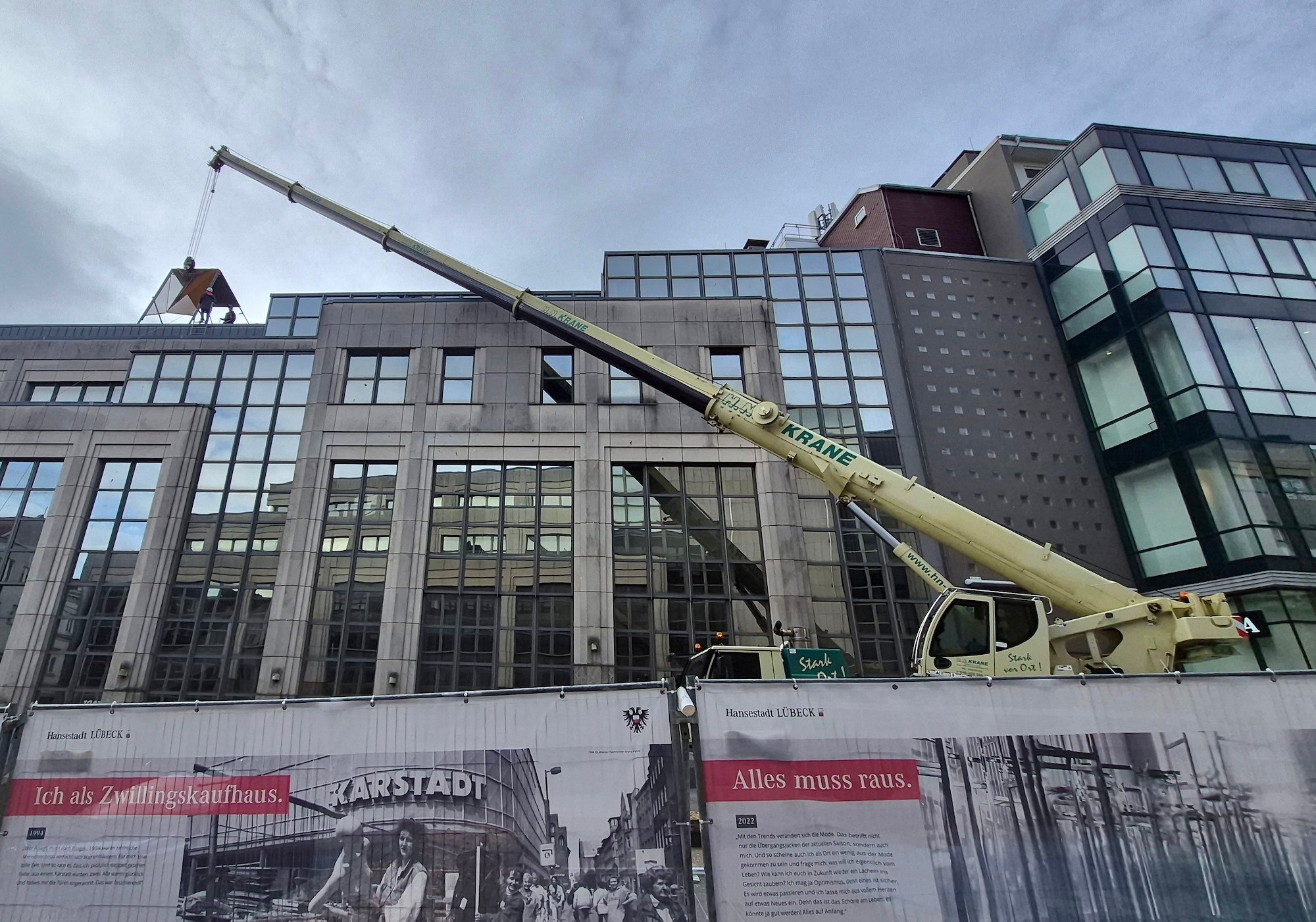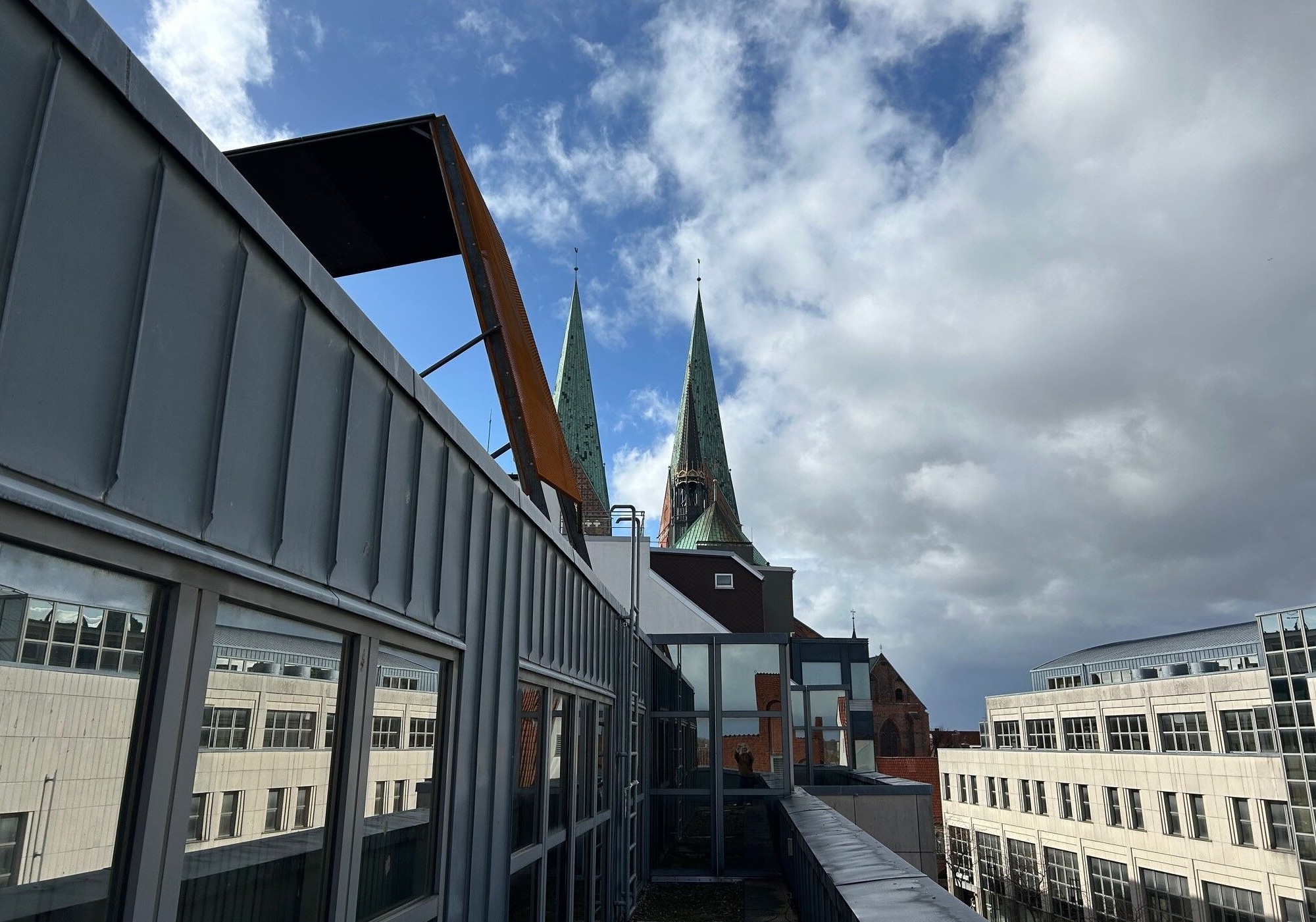 Für die zukünftige Dachgestaltung wurde eine Musterfassade der beiden neuen Obergeschosse auf dem Dach installiert. Die neuen Obergeschosse ersetzen das frühere Technikgeschoss. Die Musterfassade besteht aus Lochblech bzw. Streckmetall aus Cortenstahl.