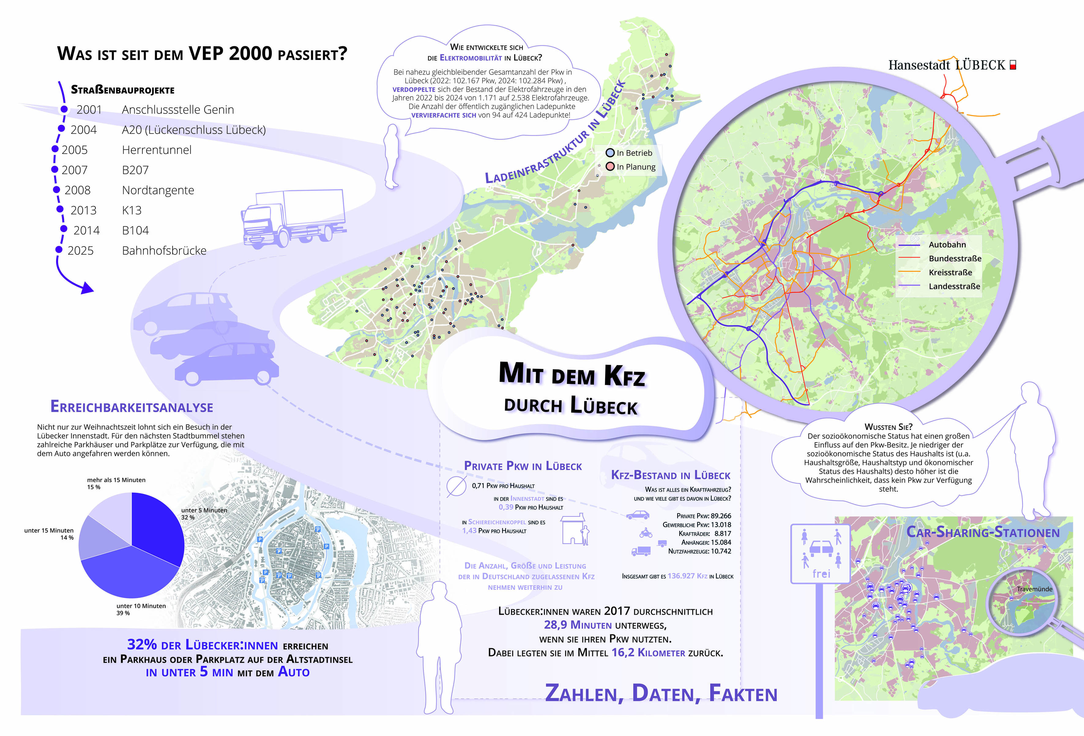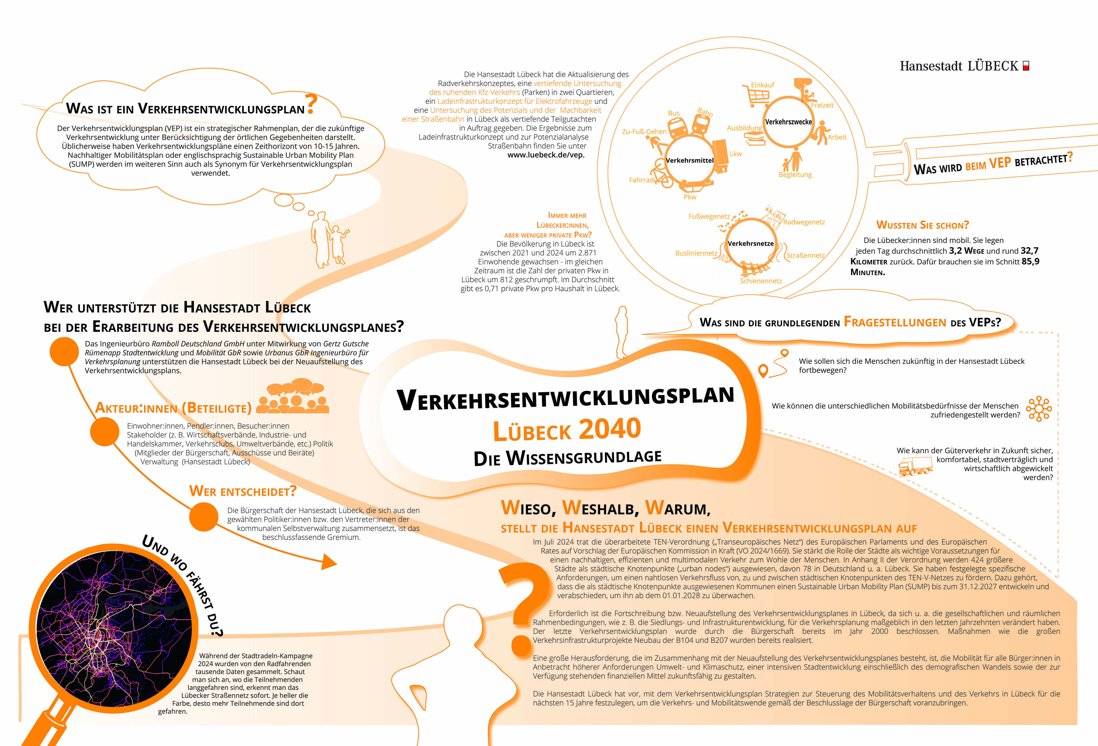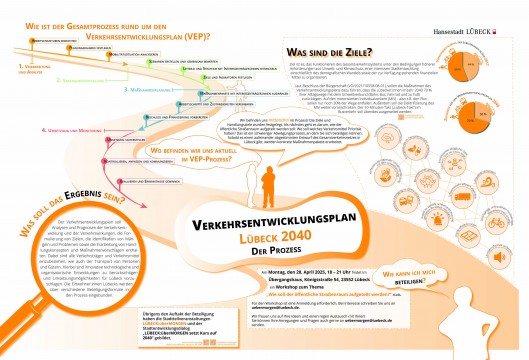 Der Verkehrsentwicklungsplan (VEP) der Hansestadt Lübeck wird neu aufgestellt. Damit wird das Ziel verfolgt, einen Rahmenplan und Strategien zur Steuerung des Mobilitätsverhaltens und des Verkehrs in Lübeck für die nächsten 15 Jahre festzulegen.