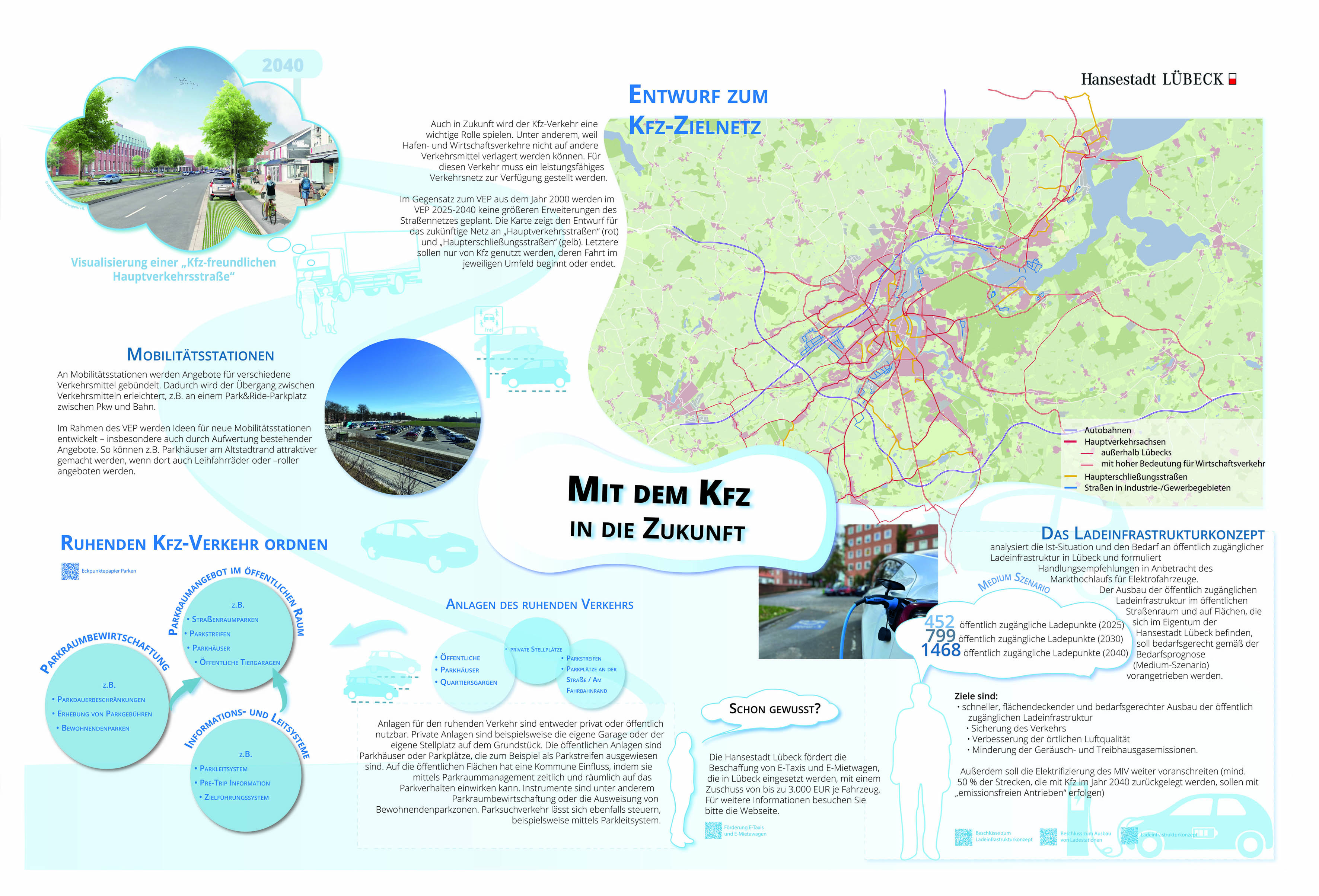 Den Auftakt der Beteiligung haben die Stadtteilveranstaltungen und der Stadtentwicklungsdialog „LÜBECK:überMORGEN setzt Kurs auf 2040" gebildet. Im Juni 2022 wurde ein erster Meilenstein des Verkehrsentwicklungsplans erreicht: Die Bürgerschaft hat Eckpunkte und Ziele für den weiteren Prozess beschlossen (VO/2021/10558-08-01). Die Anzahl der Wege, die mit dem Umweltverbund (zu Fuß, mit dem Fahrrad, per Bus und Bahn) zurückgelegt werden, sollen gegenüber dem motorisierten Individualverkehr (MIV) z. B. Pkw steigen.
