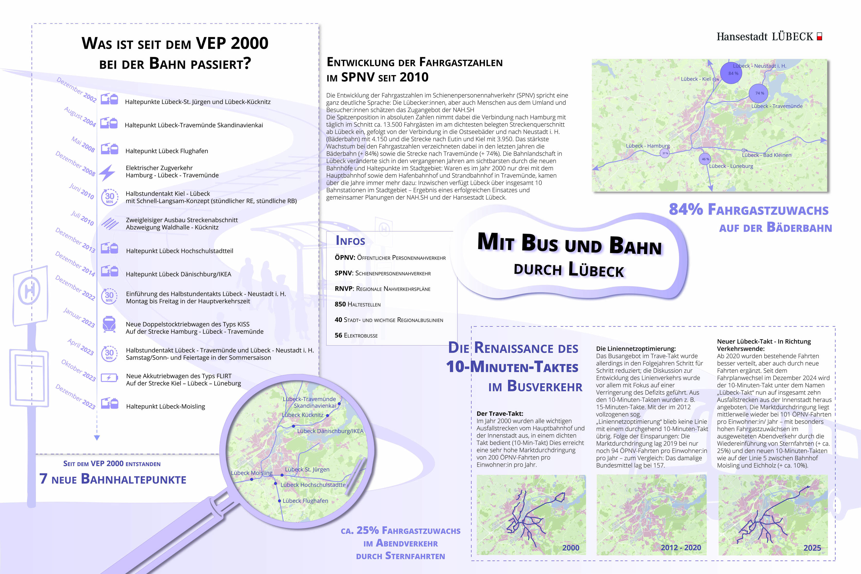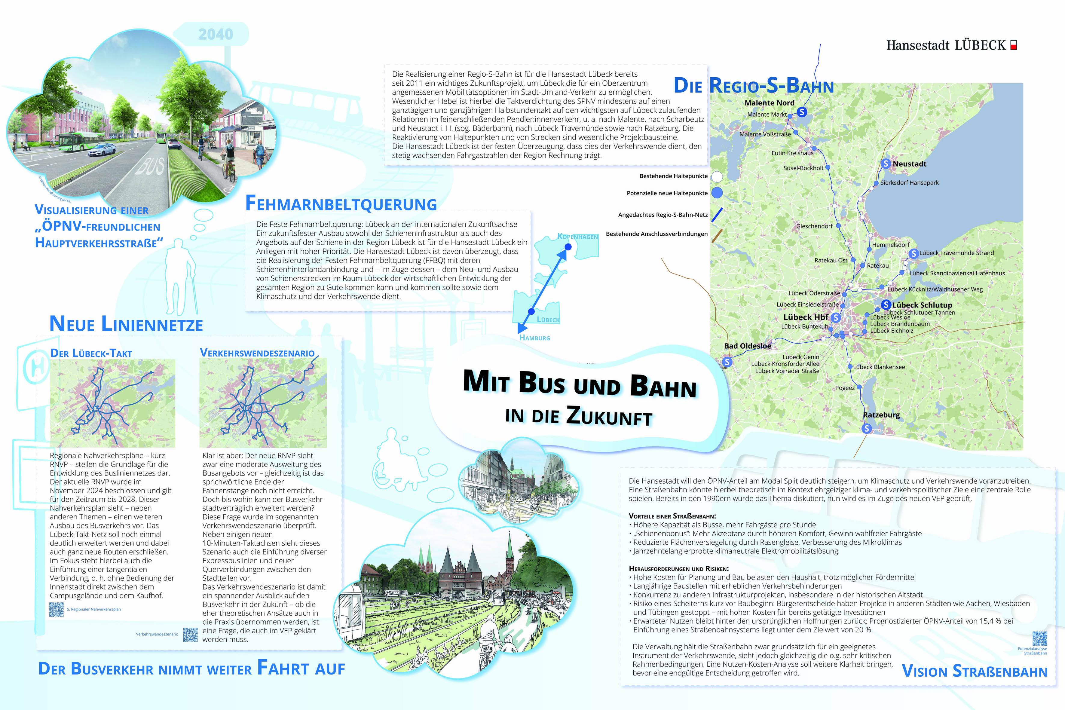 Die Bürgerschaft hat für den Prozess der Neuaufstellung des Verkehrsentwicklungsplans u. a. beschlossen (VO/2021/10558-08-01), dass das strategische Planwerk unter der Maßgabe erarbeitet wird, dass der Modal-Split nach Wegen des Umweltverbundes von 56 % (2017) auf 70 % (2040) steigt und des motorisierten Individualverkehrs (MIV) z. B. Pkw von 44 % (2017) auf 30 % (2040) sinkt. Außerdem soll die Elektrifizierung des MIV weiter voranschreiten. Der 10-Minuten-Takt („Lübeck-Takt“) im Busverkehr soll überdies ausgeweitet werden.