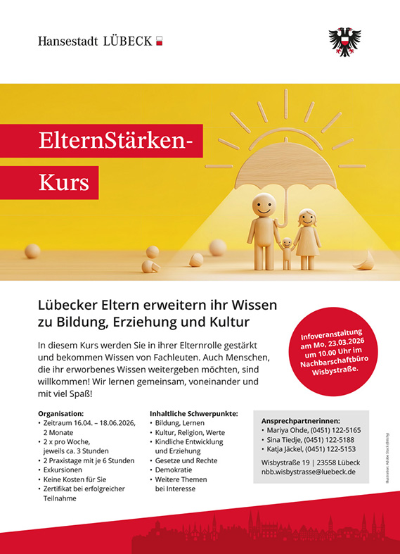 Infoveranstaltung zum ElternStärken-Kurs ist am 23.03.2026 um 10 Uhr im Nachbarschaftsbüro Wisbystraße, Wisbystraße 19, 23558 Lübeck