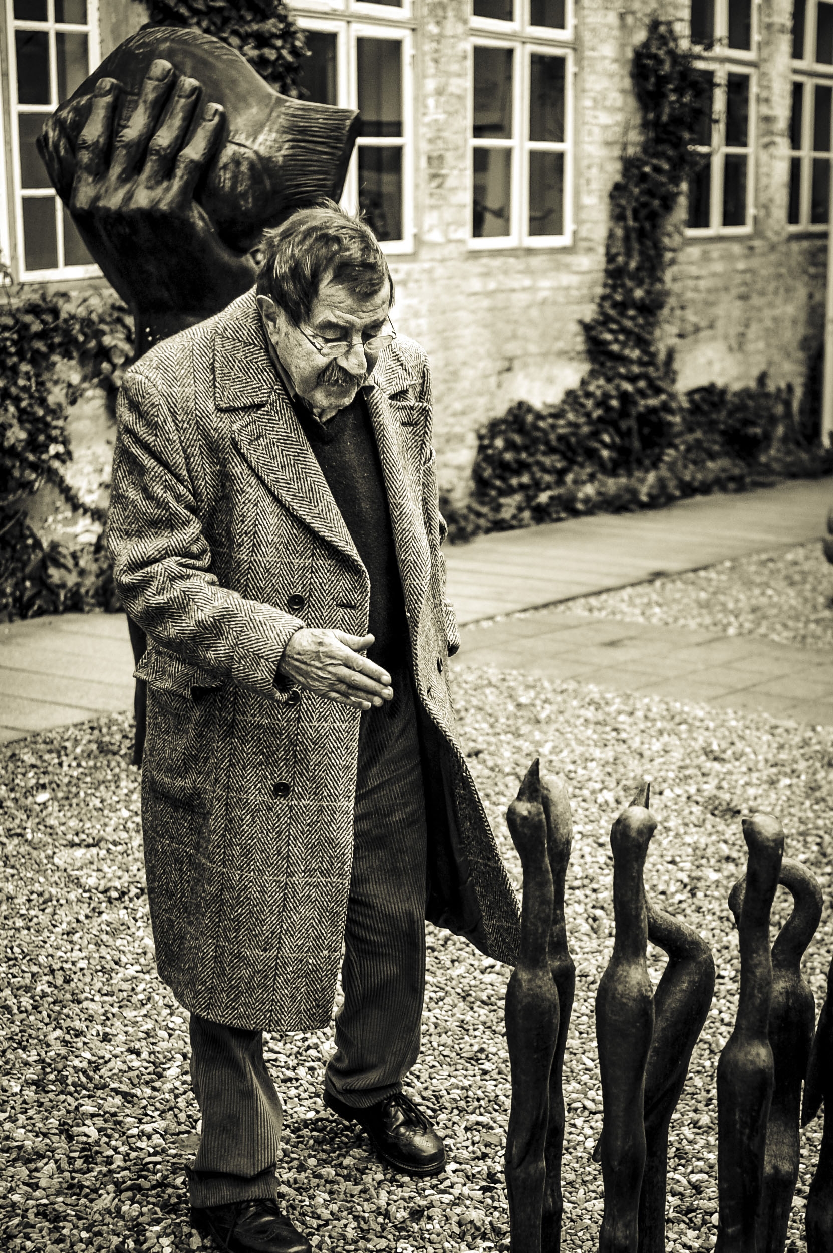 Günter Grass war Schriftsteller und ausgebildeter Bildhauer, Maler und Grafiker. Er wurde 1927 in Danzig als Sohn einer Kaufmanns-Familie geboren. Nach seiner Zeit als Luftwaffenhelfer und Soldat während des Zweiten Weltkriegs studierte er Bildhauerei in Düsseldorf und Berlin. Als Mitglied der Gruppe 47 erlebte er mit dem Roman „Die Blechtrommel“ 1959 seinen nationalen und internationalen Durchbruch. 1999 erhielt er für diesen Roman den Nobelpreis für Literatur. In zahlreichen Werken wie der Danziger Trilogie, „örtlich betäubt“, „Aus dem Tagebuch einer Schnecke“, „Im Krebsgang“ thematisiert Grass den Verlust seiner Heimat Danzig und die nationalsozialistische Vergangenheit. Daneben widmete er sich literarisch und bildkünstlerisch Themen wie Indien (Zunge zeigen), Umweltzerstörung (Totes Holz), Märchen (Der Schatten) und Alltagsthemen wie Kochen (Der Butt) und Tanzen (Letzten Tänze). Außerdem war er vielfach politisch und gesellschaftlich engagiert. So unterstützte er Willy Brandt und die SPD während der Bundestagswahlen 1965 und 1969. Außerdem übte er öffentlich Kritik: sei es durch seinen Austritt aus der Akademie der Künste aus Solidarität zu Salman Rushdie (1989), seine Laudatio auf Yasar Kemal anlässlich des Friedenspreis des Deutschen Buchhandels (1997) oder durch das Gedicht „Was gesagt werden muss“ 2012. Nach Stationen in Wewelsfleth und Hamburg ließ er sich 1986 in Behlendorf nahe Lübeck endgültig nieder.
