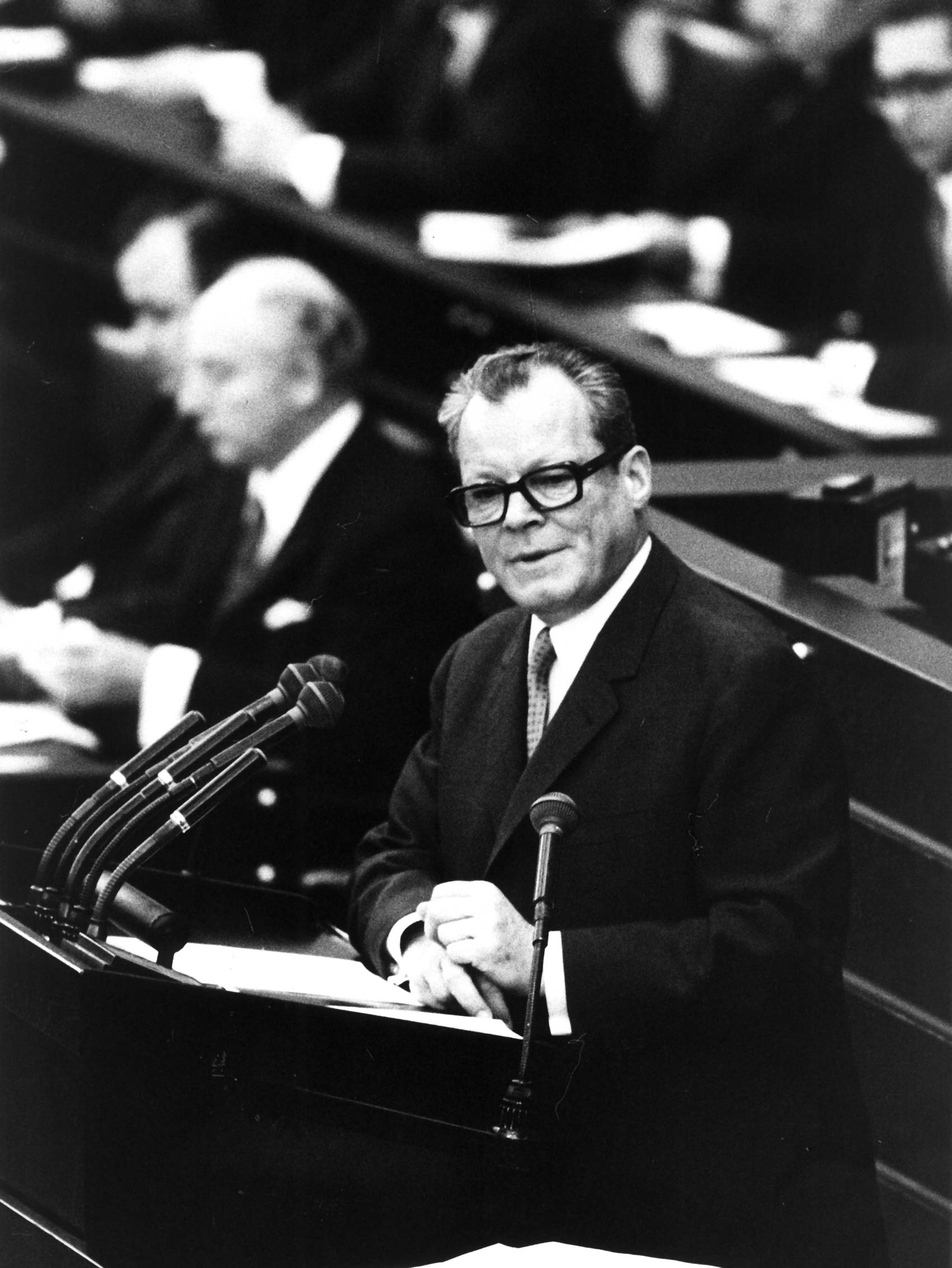 Willy Brandt, der dritte Nobelpreisträger Lübecks neben Thomas Mann und Günter Grass, kam am 13. Dezember 1913 als Herbert Frahm in Lübeck zur Welt und wuchs bei seinem Großvater auf. Schon im Alter von 16 Jahren begann sein politisches Engagement in der Sozialistischen Arbeiterjugend, gefolgt vom Eintritt in die SPD. In dieser Phase wurde er stark von seinem Förderer Julius Leber geprägt. Ein nach dem Abitur am Johanneum zu Lübeck begonnenes Volontariat bei einer Schiffsmaklerfirma musste Brandt im Jahr 1933 abbrechen, da ihm nationalsozialistische Verfolgung drohte. Brandt zog nach Norwegen, wo er auch seinen Namen änderte. Aus dem Ausland unterstützte er weiterhin die sozialistische Bewegung und auch aus dem deutschen Untergrund und arbeitete als Journalist in Norwegen. Nach dem Zweiten Weltkrieg wurde Brandt norwegischer Korrespondent in Deutschland. Brandt engagierte sich zunehmend in der Berliner SPD und wurde Brandt Mitglied des Deutschen Bundestages. Als Berliner Bürgermeister weitete er seinen Einfluss innerhalb der SPD allmählich aus und wurde in der Folge zum Vizekanzler und Außenminister Deutschlands. In dieser Zeit begründete Brandt seine Entspannungs- und Ostpolitik, für die er im Jahre 1971 mit dem Friedensnobelpreis ausgezeichnet wurde. Zusätzlich wurde Brandt ein Jahr später zum Ehrenbürger der Stadt Lübeck. Brandt fungierte von 1969 bis 1974 als Bundeskanzler einer sozialliberalen Koalition. Er prägte das Bild der Bundesrepublik in der Welt durch den berühmten Kniefall von Warschau und als erster Kanzler, der Israel bereiste. Die Enttarnung Günther Guillaumes, eines Mitarbeiters Brandts, als Spion der DDR führte zum Rücktritt des Bundeskanzlers. Im Anschluss an seine Kanzlerschaft war Brandt weiter politisch tätig. Am 08. Oktober 1992 starb Willy Brandt in Unkel bei Bonn.