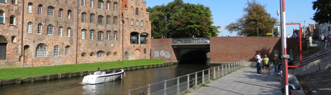 1216 wurde die hölzerne Holstenbrücke zum ersten Mal erwähnt und 1320 durch ein Hochwasser zerstört. Bis 1516 erfolgten drei Neubauten, die letzte Brücke aus Stein hielt ganze 16 Jahre. Anschließend entstand am Holstentor ein Brückenkuriosum, dessen Vorbild die Rialtobrücke in Venedig war und das bis 1853 Bestand hatte.