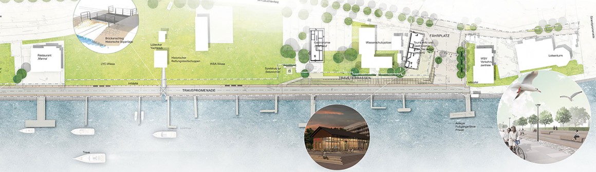 Die Gestaltungselemente der neuen Travepromenade nehmen das Thema „Dicke Pötte zum Greifen nah“ auf: Der geradlinige Verlauf als Abschluss des Landschaftsparks mit den Travewiesen und ihre Funktion als befestigte Uferkante bleiben erhalten. Großformatige Betonplatten umrahmt beziehungsweise unterbrochen von Granitpolygonalpflaster, Natur- und Feldsteinpflasterung schaffen eine Verbindung zu den vorhandenen Formaten, bieten jedoch eine gehfreundliche Oberfläche. Flankierend zum Promenade sind Spielgeräte vorgesehen, die den Kindern im Vorbeigehen die Möglichkeit bieten zu klettern, hangeln oder zu rutschen. Zahlreiche generationsübergreifende Sitzgelegenheiten werden zum Verweilen einladen. Drei neue Gastronomiegebäude, die von den ortsansässigen Betrieben errichtet werden, laden zu einer maritim geprägten ganzjährigen gastronomischen Versorgung ein. Der neue Fährplatz im Norden sowie der Kaiserbrückenplatz im Süden bilden attraktiv gestaltete Freiräume, während die naturbelassenen Travewiesen mit zahlreichen Liegeplätzen zum Verweilen einladen.