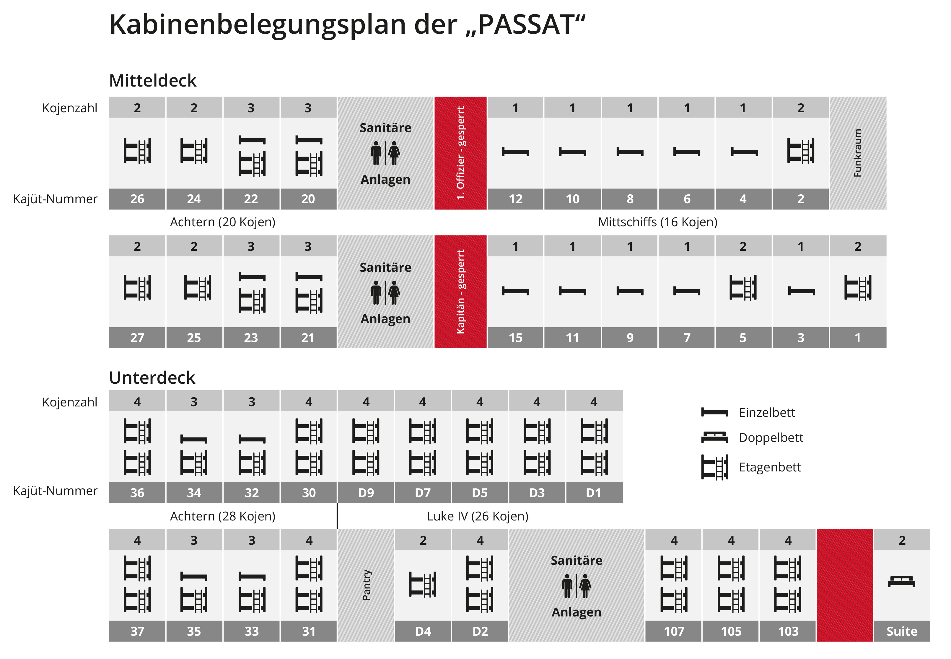 Unserem Kajütenplan ist die genaue Lage und Anzahl von 1er, 2er, 3er und 4er Kajüten zu entnehmen.